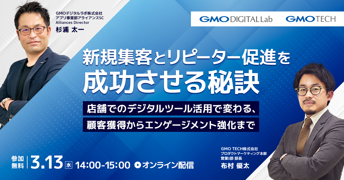 GMOインターネットグループでインターネット上の集客サービスを展開するGMO TECH株式会社(代表取締役社長CEO:鈴木 明人 以下、GMO TECH)はアプリ事業やデジタルマーケティング事業を展開するGMOデジタルラボ株式会社(以下、デジラボ)と共催し、3月13日(水)14時より、「新規集客とリピーター促進を成功させる秘訣 店舗でのデジタルツール活用で変わる、顧客獲得からエンゲージメント強化まで」と題したウェビナーを開催いたします。