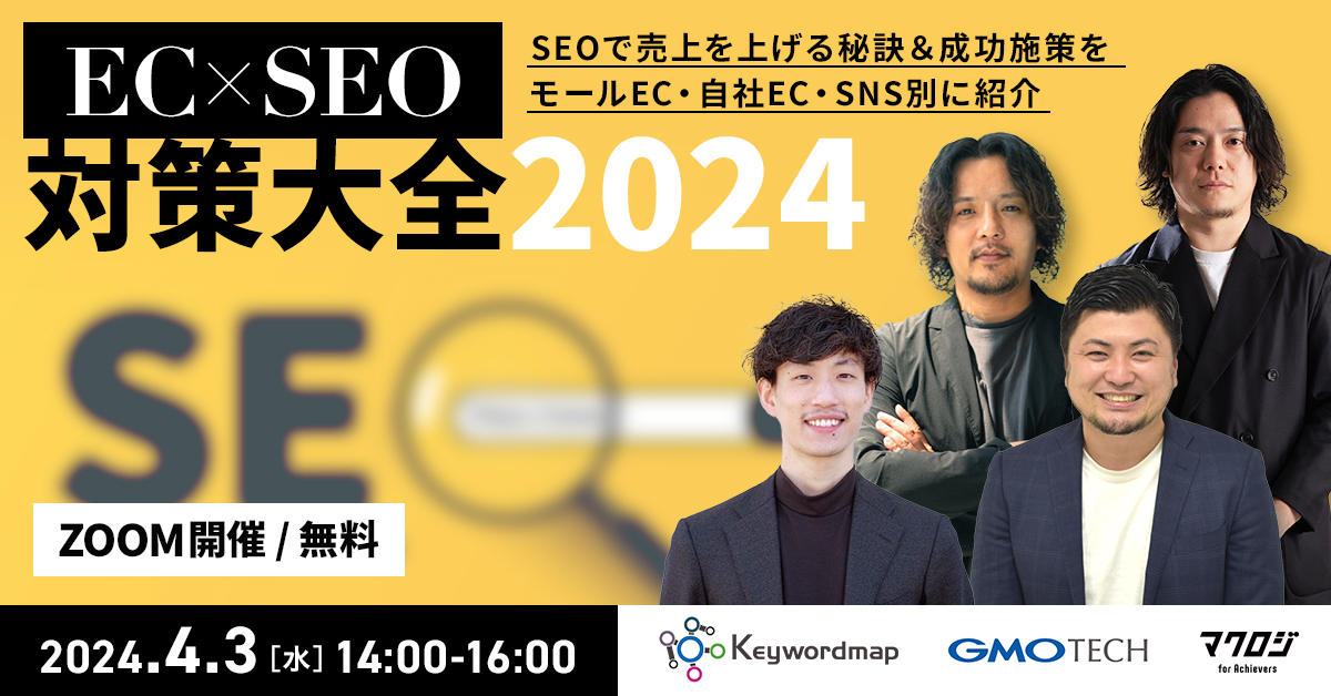 GMOインターネットグループでインターネット上の集客サービスを展開するGMO TECH株式会社(代表取締役社長CEO:鈴木 明人 以下、GMO TECH)は、ECコンサルティング事業・WEBプロモーション事業を展開する株式会社マクロジ(以下、マクロジ)、ソリューション事業、アナリティクス事業を展開する株式会社CINC(以下、CINC)と共催し、4月3日(水)14時より、「~SEOで売上を上げる秘訣&成功施策をモールEC・自社EC・SNS別に紹介~EC×SEO対策大全」と題したウェビナーを開催いたします。