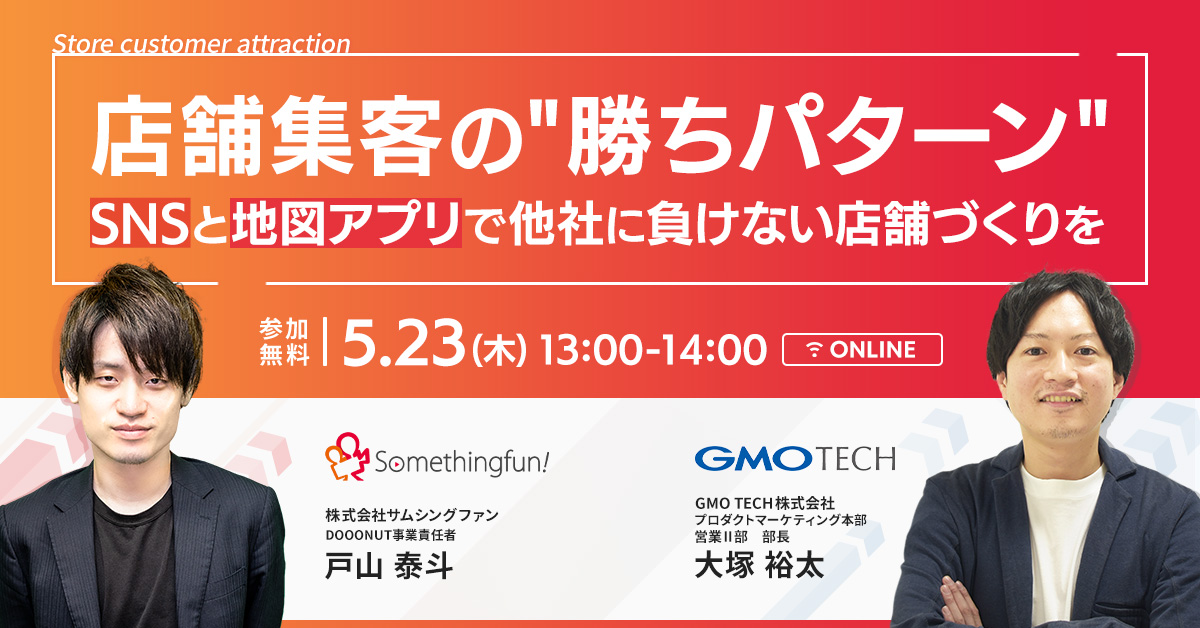 GMOインターネットグループでインターネット上の集客サービスを展開するGMO TECH株式会社(代表取締役社長CEO:鈴木 明人 以下、GMO TECH)は動画SaaS DOOOONUTの開発・販売や映像制作をおこなう株式会社サムシングファン(以下、サムシング)と共催し、5月23日(木)13時より、「SNSと地図アプリの活用で店舗集客を成功へ 今押さておくべきプロモーション戦略」と題したウェビナーを開催いたします。
