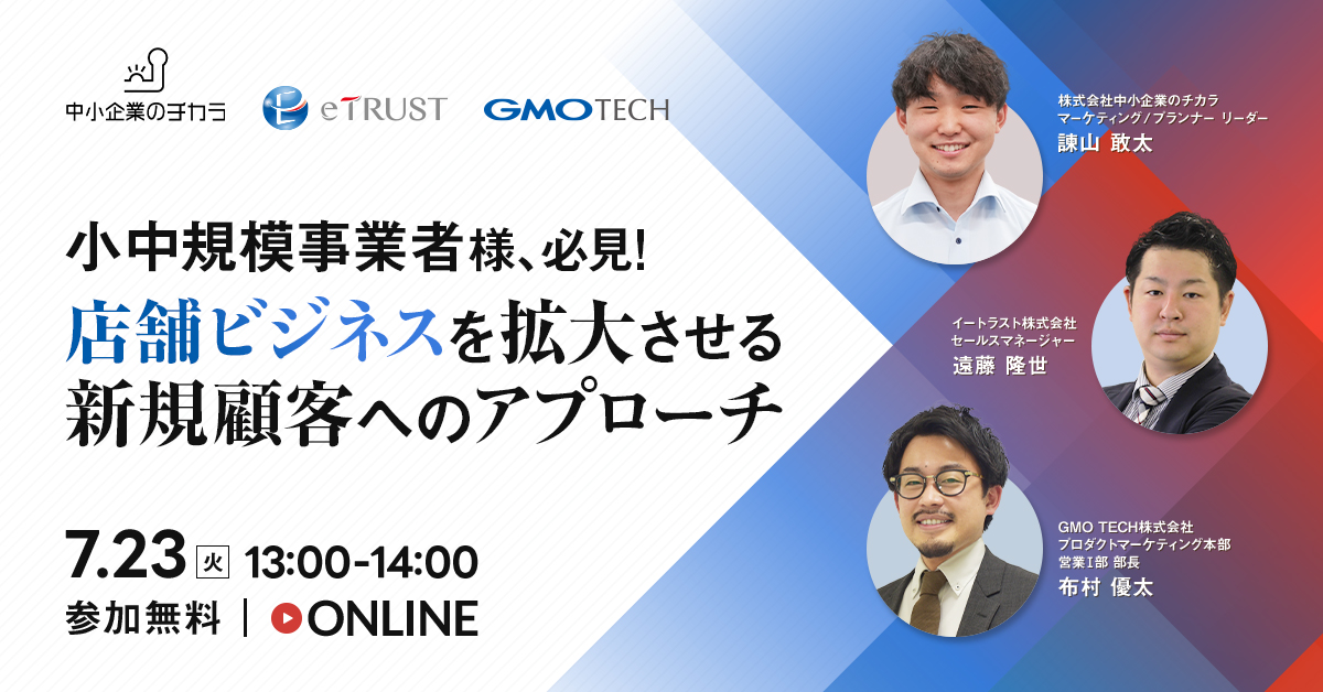GMOインターネットグループでインターネット上の集客サービスを展開するGMO TECH株式会社(代表取締役社長CEO:鈴木 明人 以下、GMO TECH)は、Webマーケティング支援をおこなう株式会社中小企業のチカラ、およびホームページ制作をおこなうイートラスト株式会社と共催し、7月23日(火)13時より、「店舗ビジネスで勝つ!小中規模事業者様でもできる新規顧客を急増させるマーケ施策」と題したウェビナーを開催いたします。