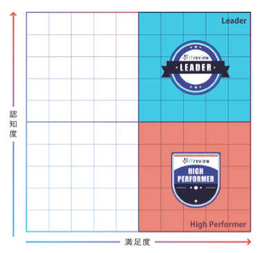 「ITreview Grid」でユーザー評価の高い2領域を表彰し、満足度・認知度両方の領域で高い評価を得たプロダクトには『Leader』バッジが発行され、満足度が高い領域のプロダクトには『High Performer』バッジが発行されます。