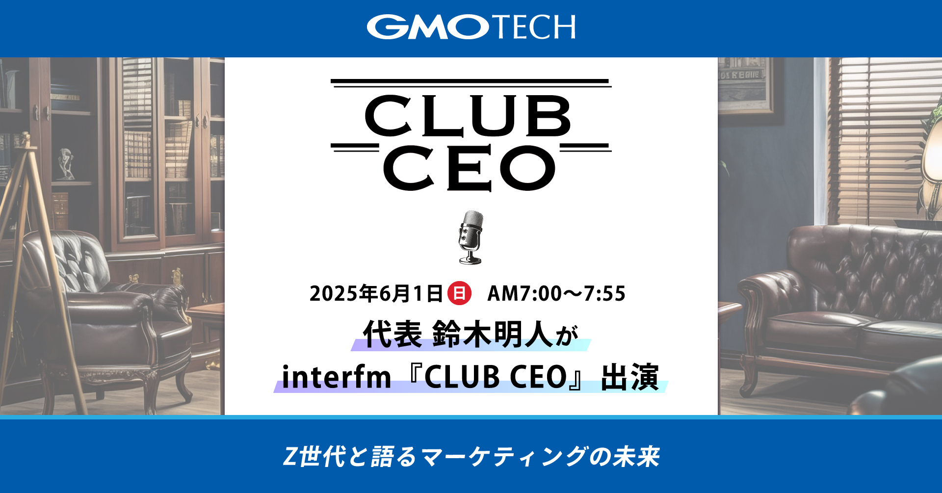 2025年6月1日(日)朝7:00〜7:55放送予定のinterfm(89.7MHz)のラジオ番組「CLUB CEO」に、GMO TECH株式会社 代表取締役社長CEOの鈴木明人が出演いたします。