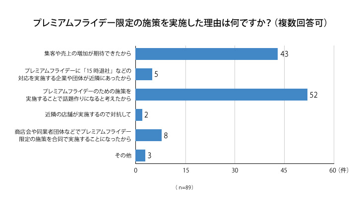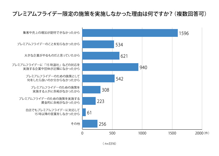 一方で、プレミアムフライデーに集客や販促のための施策を実施しなかった店舗にその理由を聞いたところ「集客や売上の増加が期待できなかったから」という回答が最多となりました。「プレミアムフライデーに『15時退社』などの対応を実施する企業や団体が近隣になかったから」という回答も多く、自分の経営するお店に影響が波及するイメージを持てない店舗経営者が多かったことがうかがえます。