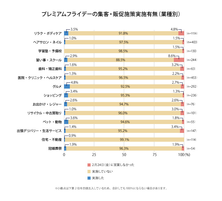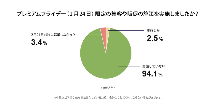 一方で、プレミアムフライデーのための集客や販促の施策を実施したかどうかについて尋ねたところ、「実施した」という店舗は2.5%にとどまりました。