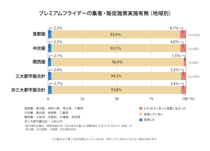プレミアムフライデーの集客施策実施状況について、地域別でまとめると、関西圏で「実施していない」割合が高いことが分かりました。