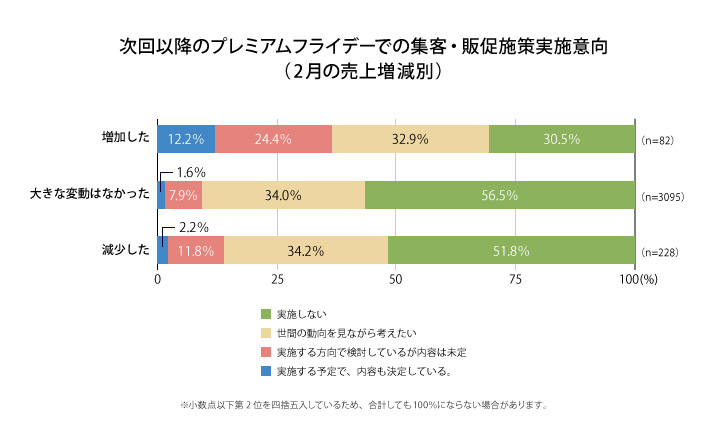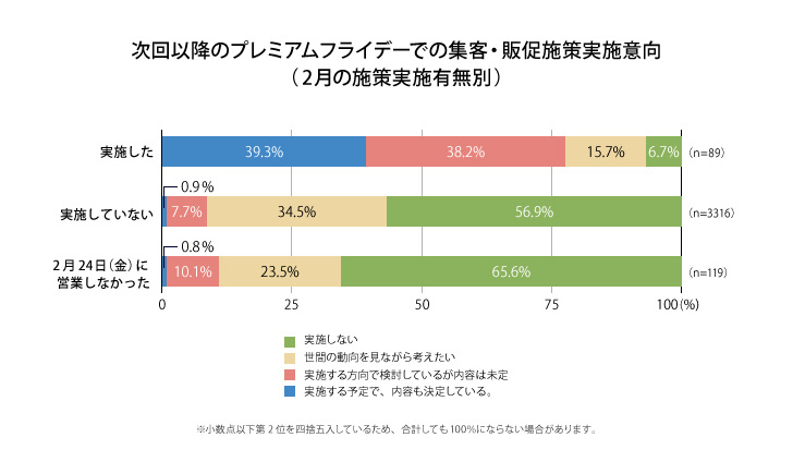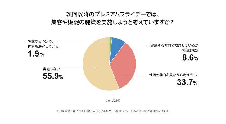 また、2月のプレミアムフライデーに売り上げが「増加した」と回答した店舗でも、3月以降のプレミアムフライデーで集客や販促の施策を「実施する」「実施する方向で検討」としたのは約37%にとどまりました。