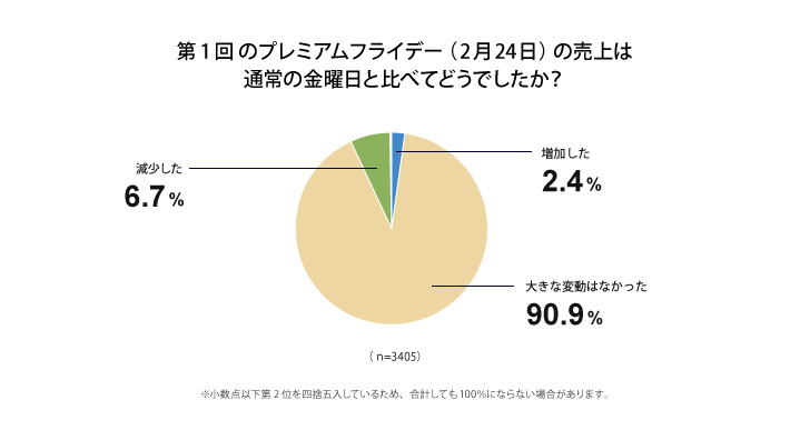 実際に2月24日の売り上げが普段の金曜日と比べて変動したかどうかを聞いたところ、90.9%の店舗が「大きな変動はなかった」と回答しました。「増加した」と答えた店舗は2.4%にとどまり、「減少した」と答えた店舗も6.7%いました。