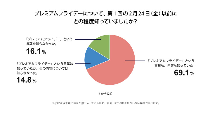 プレミアムフライデーについて、初回の取り組みが行われた2017年2月24日以前にどの程度知っていたか尋ねたところ、約70%の人が「言葉も、内容も知っていた。」と回答し、「言葉は知っていたが、その内容については知らなかった。」という回答と合わせて、84%の人がプレミアムフライデーの存在について認知していたことが分かりました。