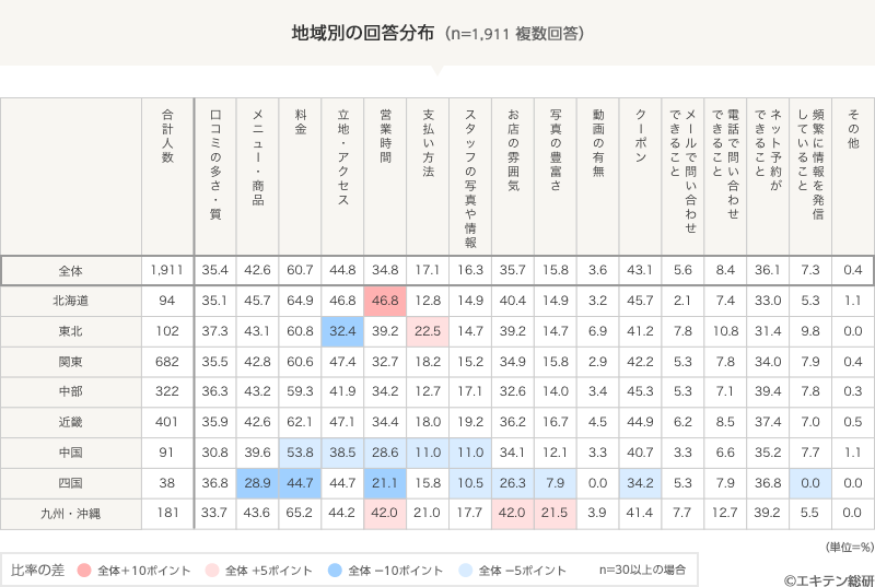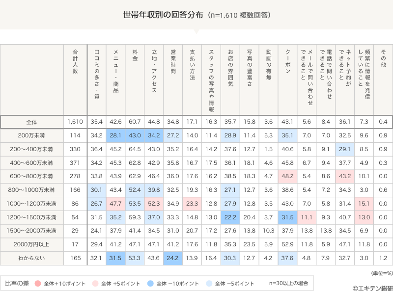 世帯年収別の傾向が上記の表です。1,000~1,200万円未満の世帯年収層では、「立地・アクセス」「メニュー・商品」および「支払い方法」や「頻繁に情報を発信していること」が全体に比べて高い傾向が見られます。