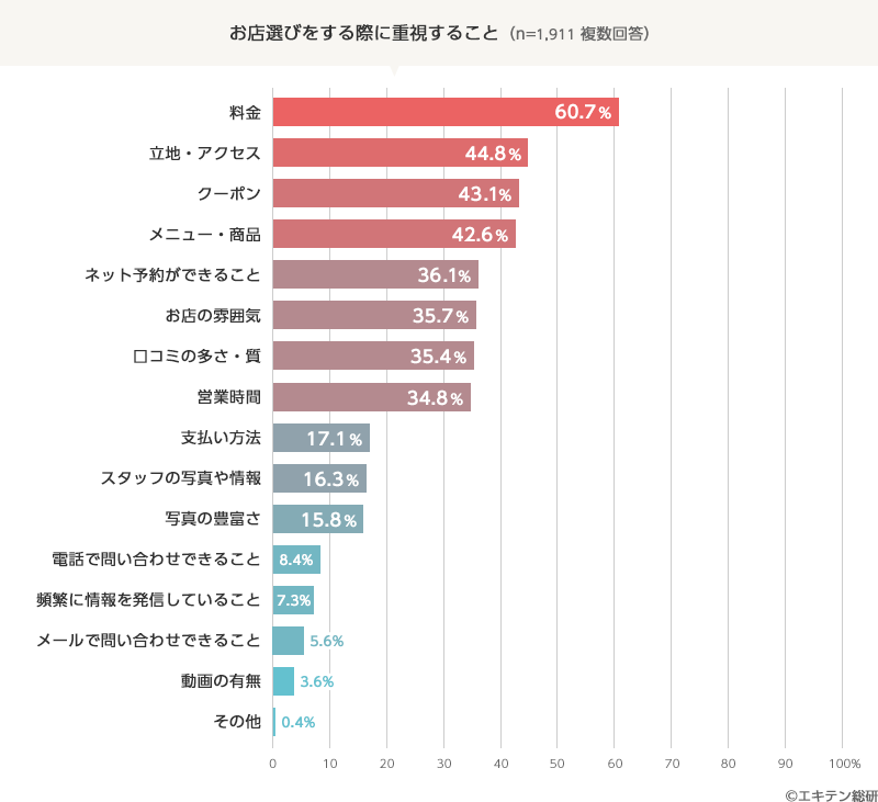 また、料金や立地などの基本的な店舗情報以外に、「ネット予約ができること」や「お店の雰囲気」「口コミの多さ・質」など、具体的に意思決定をするための機能や情報も重視されているという傾向が見られました。