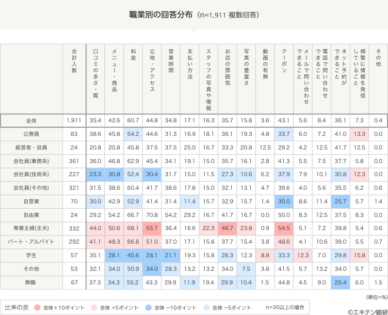 職業別の傾向としては、専業主婦(主夫)は、「立地・アクセス」「お店の雰囲気」「クーポン」の項目をより重視しているという結果に。交通利便やお店の雰囲気、お得さがお店探しのポイントとして捉えられやすい傾向にあるようです。なお、公務員、技術系の会社員、学生などは、他の職業と比べて「頻繁に情報を発信していること」を重視しており、情報の新鮮さを求める傾向が強いと言えそうです。