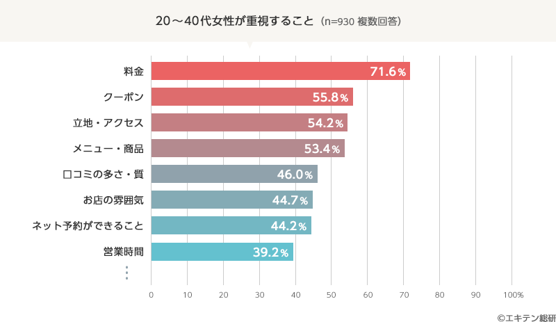 「店舗情報サイトで店舗情報を調べる」と回答した人の構成比で最も高くなった20~40代女性では、他の性・年代層に比べて「料金」や「クーポン」といったお金に関わる項目が重視されているという結果に。お得なお店を選びたいという意向が強い傾向にあるようです。
