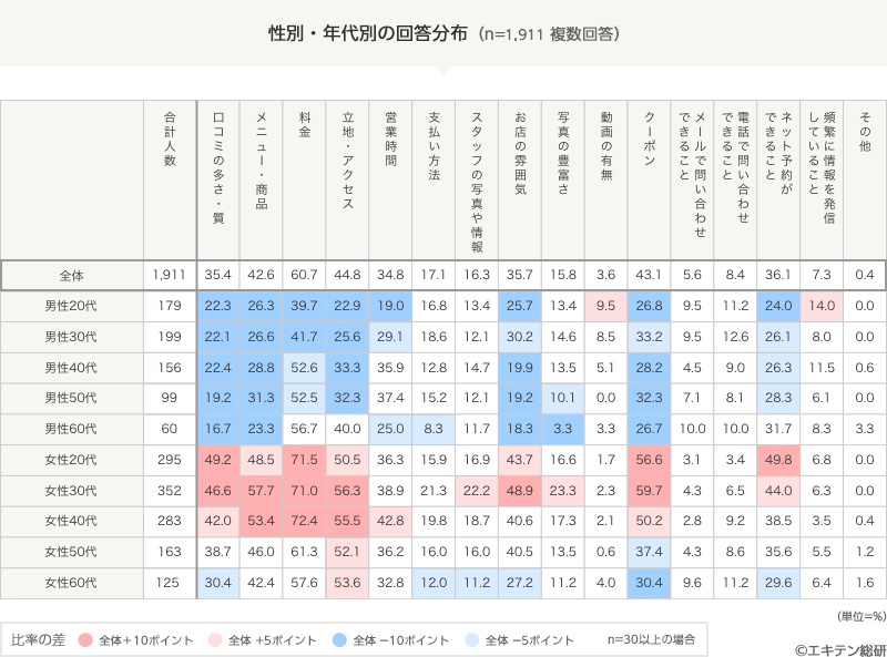 【店舗情報を調べる際に重視すること/性別・年代別データ】