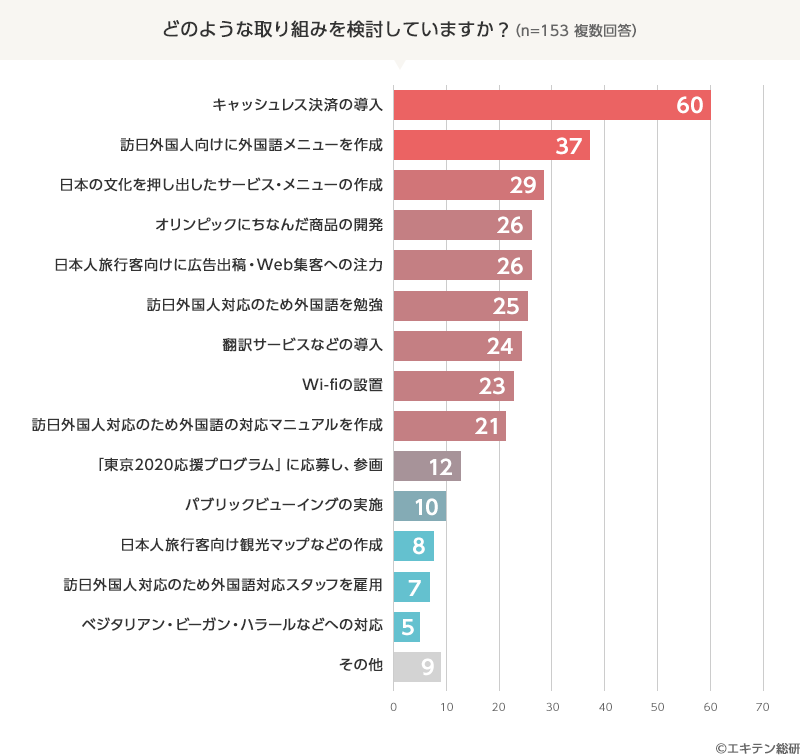 今後、取り組みを実施する予定と回答した店舗については、キャッシュレス決済導入についで、「外国語メニューを作成する」「日本の文化を押し出したサービス・メニューを用意する」と回答。オリンピックを機に日本を訪れる外国人の方に喜んでいただけるサービスやメニューを提供したい、という経営者の思いを感じることができます。
