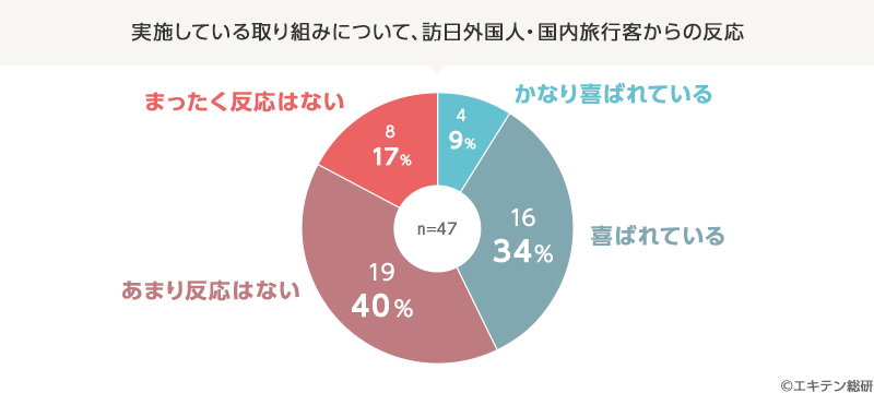 すでに実施している取り組みについては、約4割の店舗が「かなり喜ばれている」「喜ばれている」と回答。また、同じく4割の店舗が「売上または客数が増えた」と回答。東京オリンピック・パラリンピックまで半年以上ありますが、すでに4割の店舗が効果を実感していることが分かります。