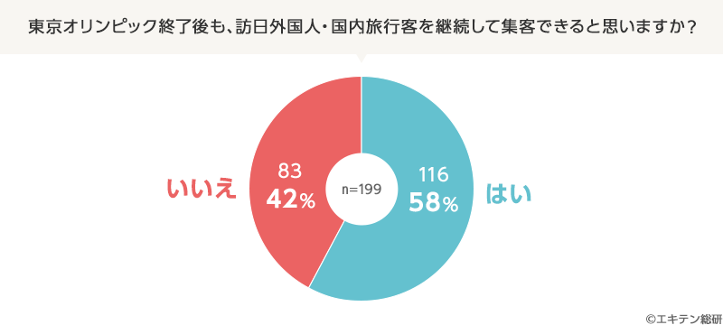 東京オリンピック・パラリンピック終了後については、約6割の店舗が訪日外国人・国内旅行客を継続的に集客できると回答。一時的な盛り上がりだけではなく、2020年8月以降も継続した集客を見込んでいる店舗が一定程度いるようです。