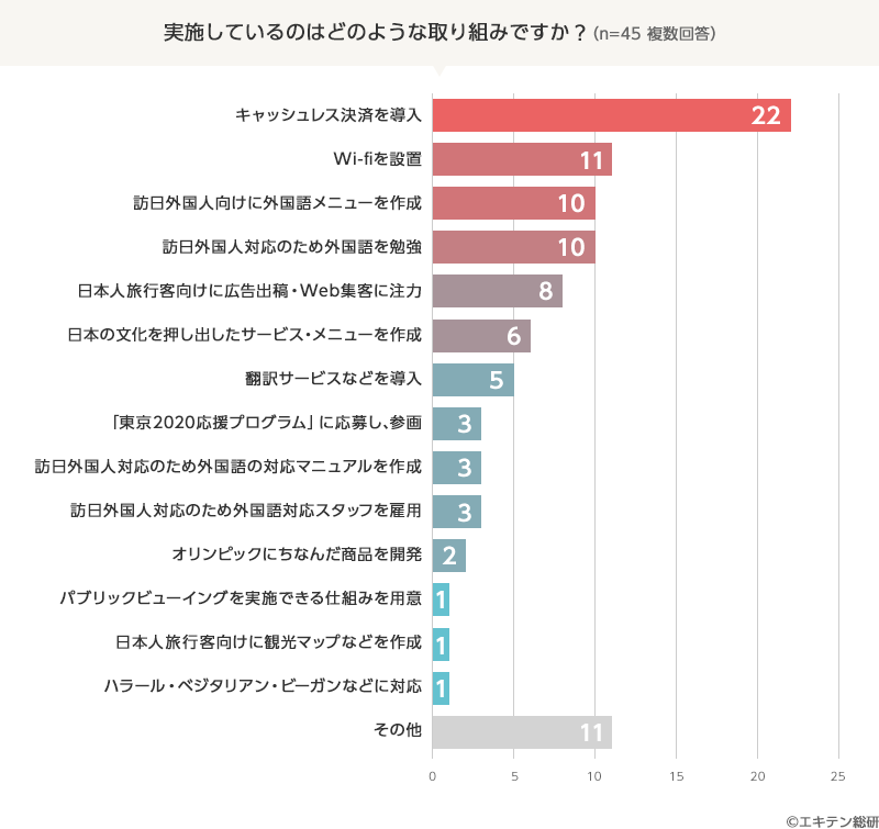 すでに取り組みを実施していると回答した店舗のうち約半数が、「キャッシュレス決済を導入した」と回答。また、「Wi-fiを設置した」「外国語メニューを作成した」「外国語を勉強した」など、外国人旅行客の方へのサービス環境を整備していることが分かる結果に。