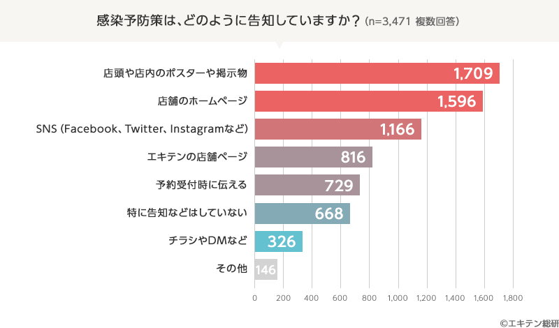 感染予防策を講じている店舗の8割が、予防策を講じていることについて何かしらの形で告知をしているという結果に。店頭や店内の掲示、ホームページでお知らせしている店舗が多いことがわかります。
