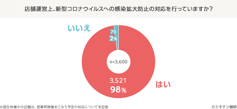 実に98%の店舗が、感染拡大防止の対応策を講じていると回答。中小事業者においても、新型コロナウイルス感染予防への意識の高さが伺えます。