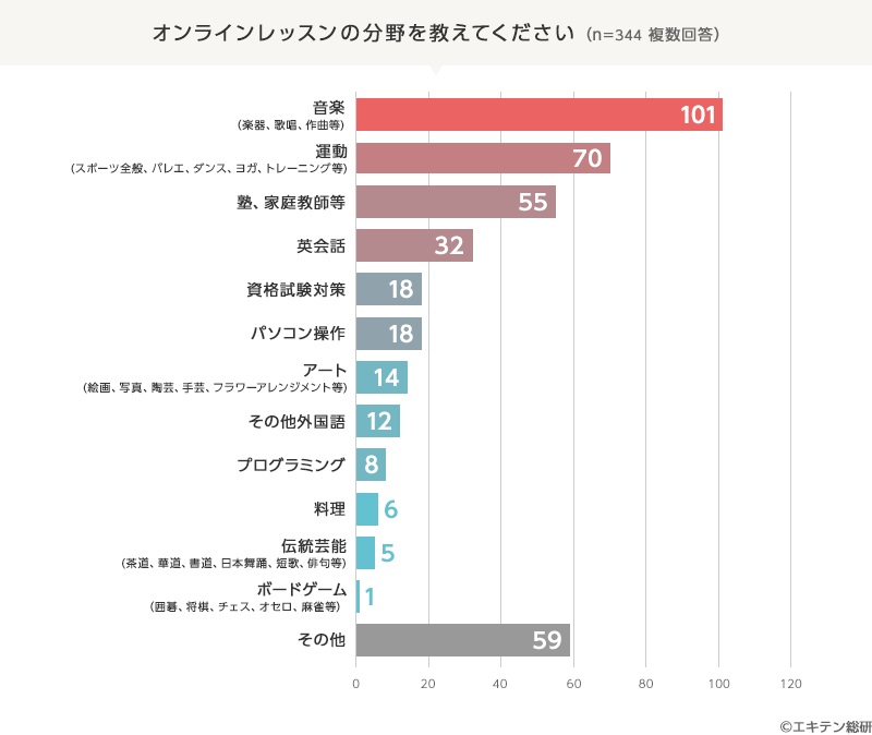 オンラインレッスンの分野として最も多かったのが楽器や歌唱などの音楽ジャンルでした。