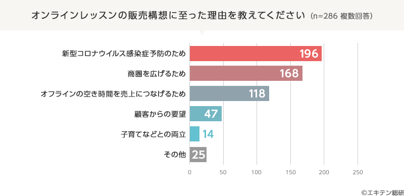 これからオンラインレッスンを実施しようと考えている店舗に関しては、すでに実施している店舗と同じように、感染予防対策として実施しようと考えている店舗が多数となりました。また、半数以上の店舗が「商圏を広げるため」と回答。オンラインレッスンで新たな売上の確保に期待している店舗が一定数いるようです。