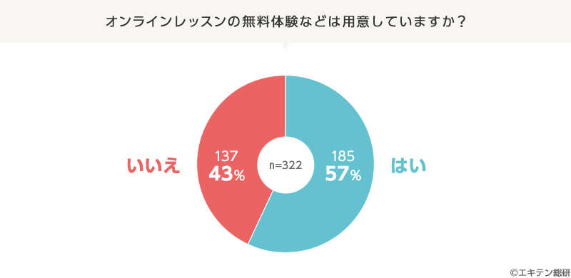 無料体験については、半数以上の店舗が用意していると回答。2020年4月以降にオンラインレッスンを開始した店舗が多くを占めています。休業要請後に急遽オンラインレッスンを開始した店舗は、ネット接続環境やレッスンの進行方法などを確認するため、試験的に無料体験を用意したケースもあるのではと予想できます。
