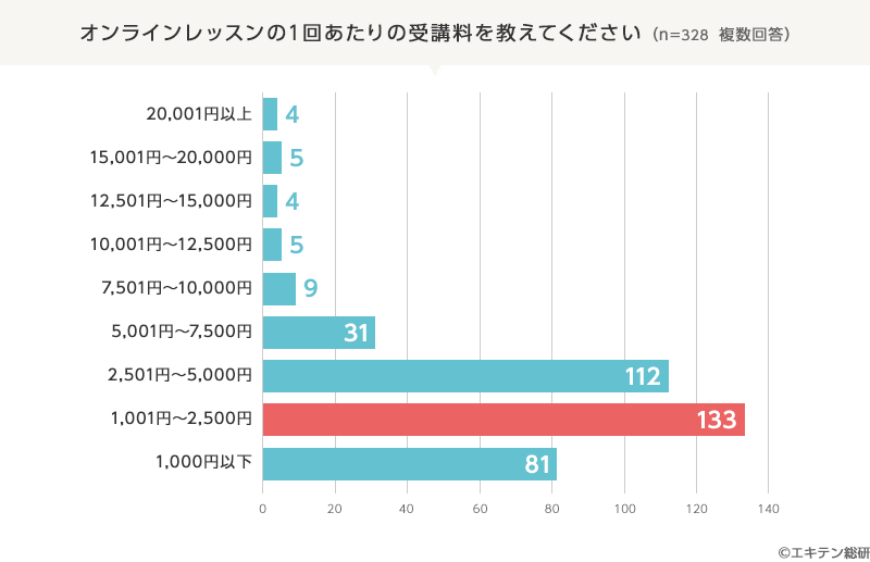 塾・家庭教師の分野では、120分以内と回答した店舗が、英会話の分野では60分以内に次いで120分以内と回答した店舗が多くなり、その他の分野の店舗よりも長くオンラインレッスンの時間を設定していることが分かりました。価格は、1,001円~2,500円と、2,501円~5,000円の価格設定の店舗が半々です。