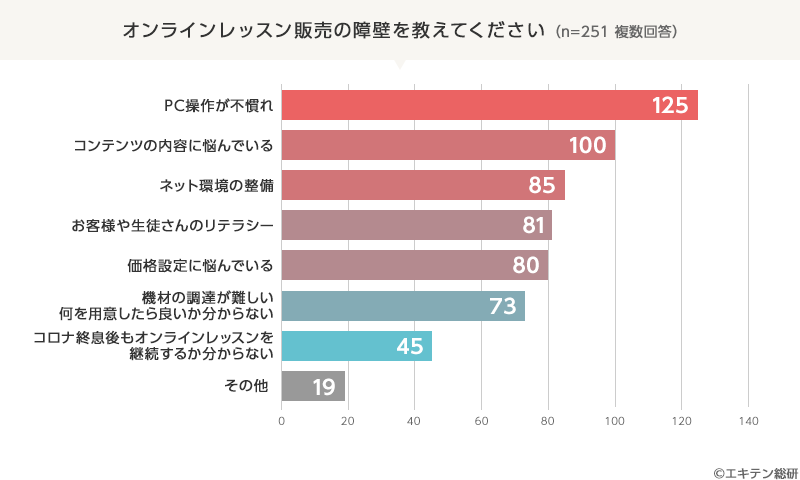 オンラインレッスンを実施していない店舗は、何を障壁と感じているかという問いに対し、「PC操作が不慣れ」「コンテンツの内容に悩んでいる」「ネット環境の整備」と回答した店舗が多くなりました。