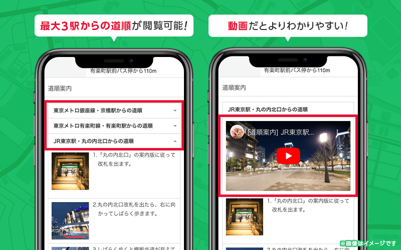 例えば丸の内にある店舗の場合、「東京メトロ銀座線 京橋駅」「東京メトロ有楽町線 有楽町駅」「JR 東京駅」など3駅からの道順を、ユーザーは参照することができます。道順は画像と文章のほか、動画で見ることも可能です。