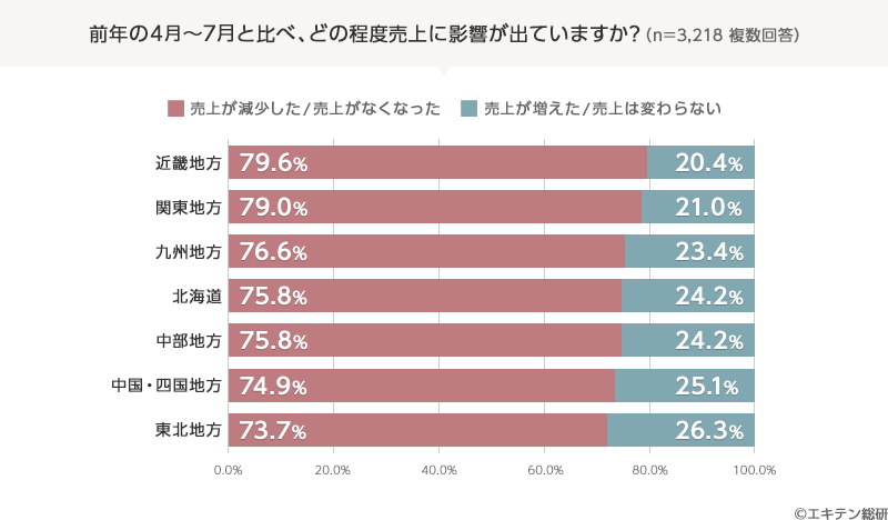 地域別に分析してみると、営業時間短縮の要請が長引いた東京・大阪を含む関東地方と近畿地方で、「売上が減少した/売上がなくなった」と回答した店舗が約8割にのぼりました。