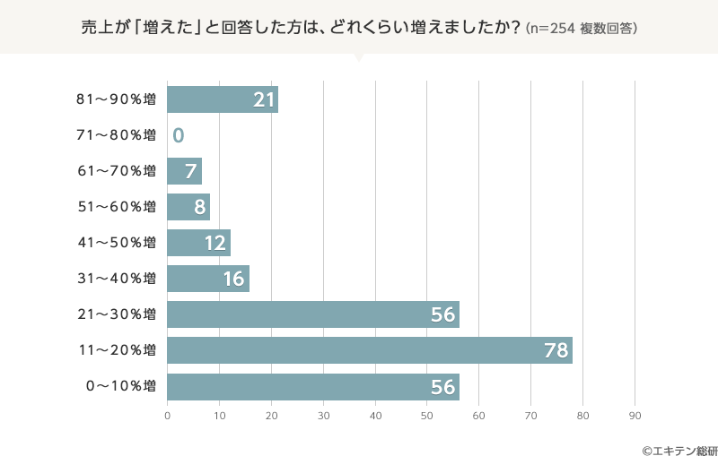 一方、「売上が増えた」と回答した店舗はどれくらい増えたか、という問いに対し、約3割の店舗が「11~20%増えた」と回答しました。「81~90%増」と回答した店舗の詳細を見てみると、「便利屋」や「ペットショップ」などの業態で、コロナ禍での消毒作業や、巣篭もりで増えたペット需要などの影響を受けているようです。