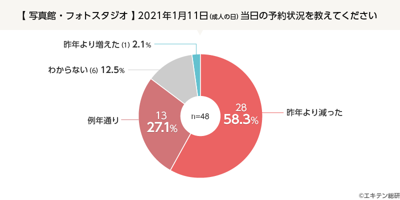 写真館・フォトスタジオを運営する店舗では、「例年通り」と回答した店舗は27.1%にとどまり、「昨年より減った」と回答した店舗が約6割を占めるという結果になりました。