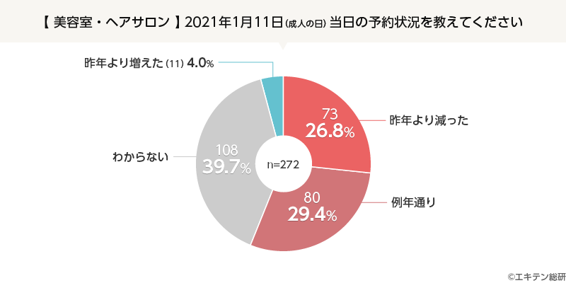 予約状況をジャンル別に分析してみると、美容室・ヘアサロンの店舗では「例年通り」と回答した店舗が29.4%と「昨年より減った」と回答した店舗をわずかに上回りました。一方で、アンケート実施の12月4日~7日の時点で「わからない」と回答した店舗が4割近くを占めました。自治体により式典の延期や中止・オンラインでの開催など、方針が未定の部分も多く新成人の着付けやヘアセットなど、予約の見通しが立たない店舗も多いようです。