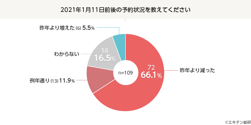 コロナ禍の密を避けるため成人の日当日ではなく、前後の日程に予約が分散することも予想し、1月11日前後の予約状況についても尋ねてみたところ、全体の6割以上の店舗が「昨年より減った」と回答しました。