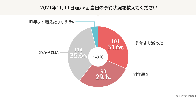 31.6%の店舗が、成人の日の予約状況は「昨年より減った」と回答。また、自治体により式典の延期や中止・オンラインでの開催など、方針が未定の部分も多く、「わからない」と回答した店舗も35.6%となりました。