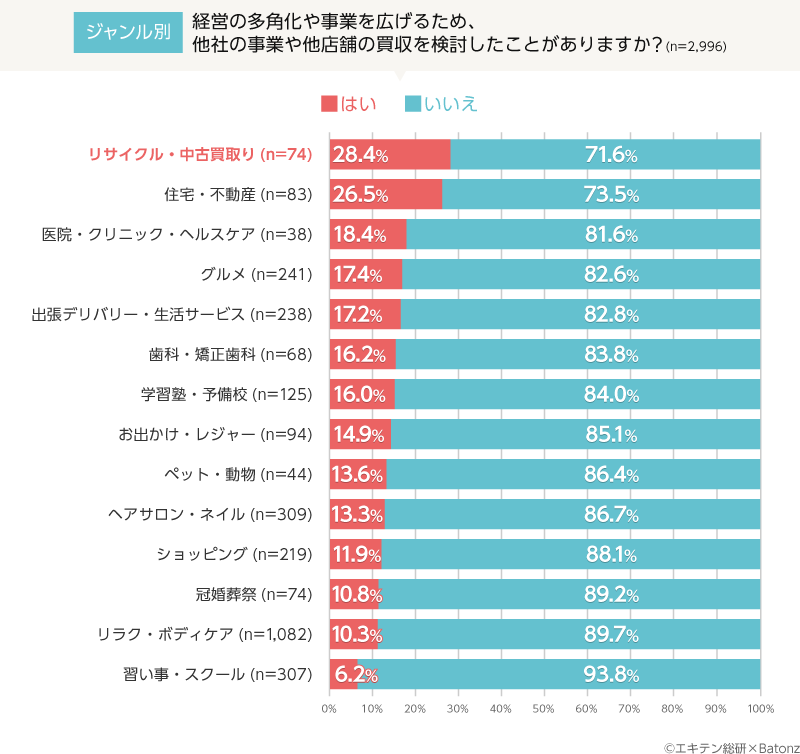 また、リサイクル・中古買取りの店舗では「他社の事業や他店舗の買収を検討したことがありますか」という問いに28.4%が「はい」と回答しており、全体平均より15%も多くの店舗が他店舗の買収を検討したことがあることがわかります。リサイクル・中古買取りの業界は、同業者間のつながりが深く、廃業する店舗を他店舗が買収する事業者間の事業承継も多いようです。