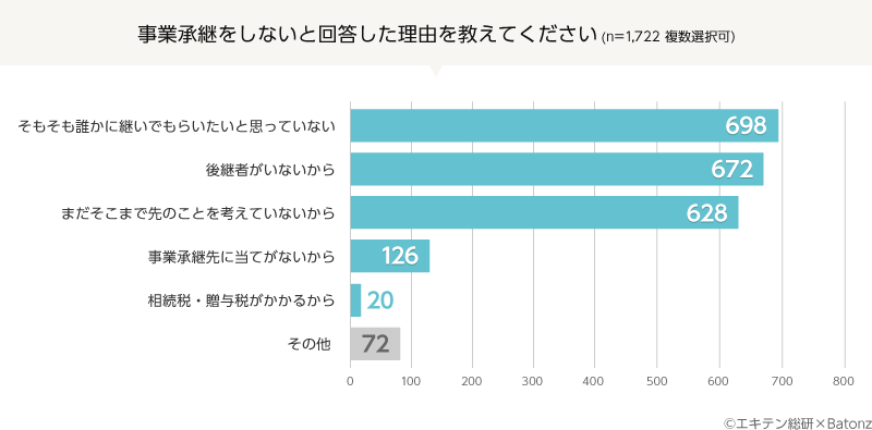 事業承継をしないと回答した店舗に理由をたずねると、「そもそも誰かに継いでもらいたいと思っていない」と回答した店舗が最多となりました。ついで、「後継者がいないから」と回答した店舗も多く、中小事業者において後継者不足は大きな課題となっています。