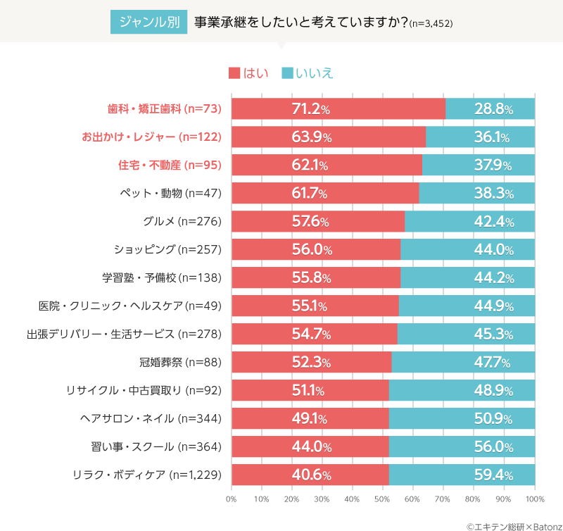 店舗のジャンル別に分析してみると、「歯科・矯正歯科」、「お出かけ・レジャー(旅館やレジャー施設等)」、「住宅・不動産」のジャンルで事業承継をしたいと考えている店舗が多いことが分かります。