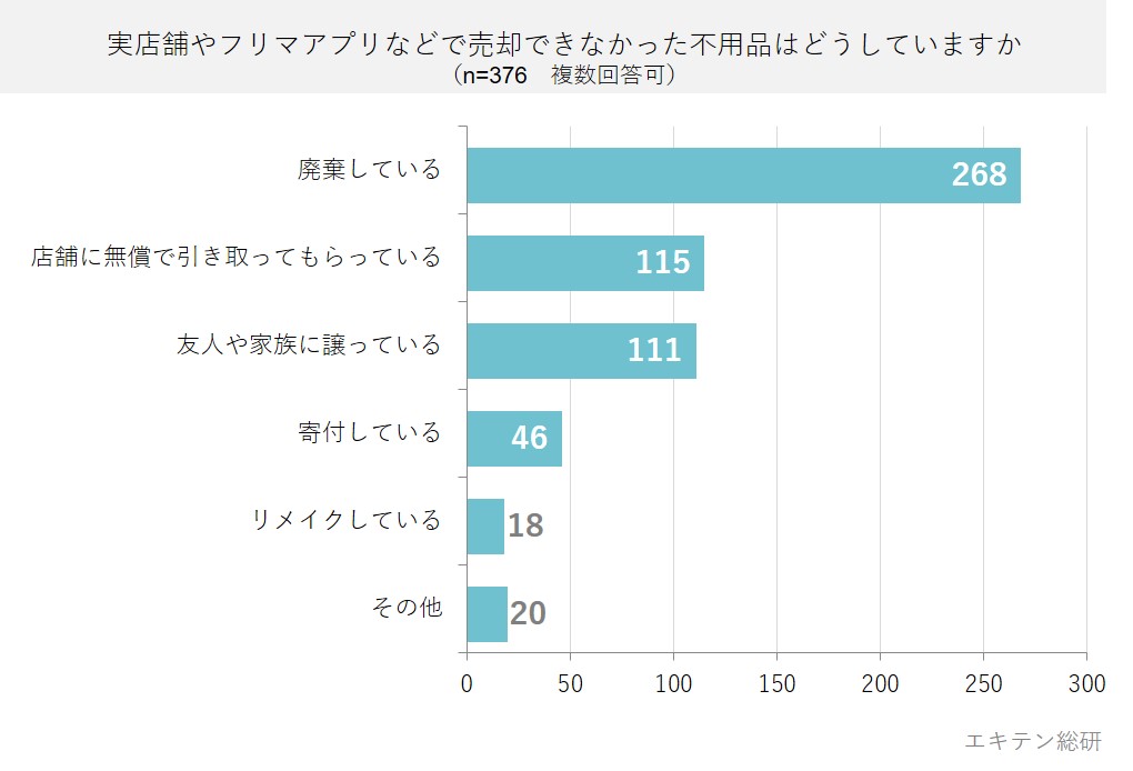 実店舗やフリマアプリなどで売却できなかった不要品に関しては、376名中268名が「廃棄している」と回答しました。リサイクル店でも、買取金額のつかない商品の無償引き取りはおこなっていない店舗もあり、「店舗に無料で引き取ってもらっている」と回答した人は115人にとどまりました。