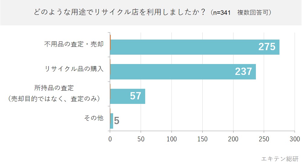 リサイクル店の利用用途については「不用品の査定・売却」と回答した人が最も多くなり、続いて「リサイクル品の購入」が続きます。「不用品の査定・売却」、「リサイクル品の購入」をどちらも選択したユーザーは回答者341名のうち約半数の175名となり、不用品の売却だけではなく、新たに購入もしたいニーズも一定数あることがうかがえます。
