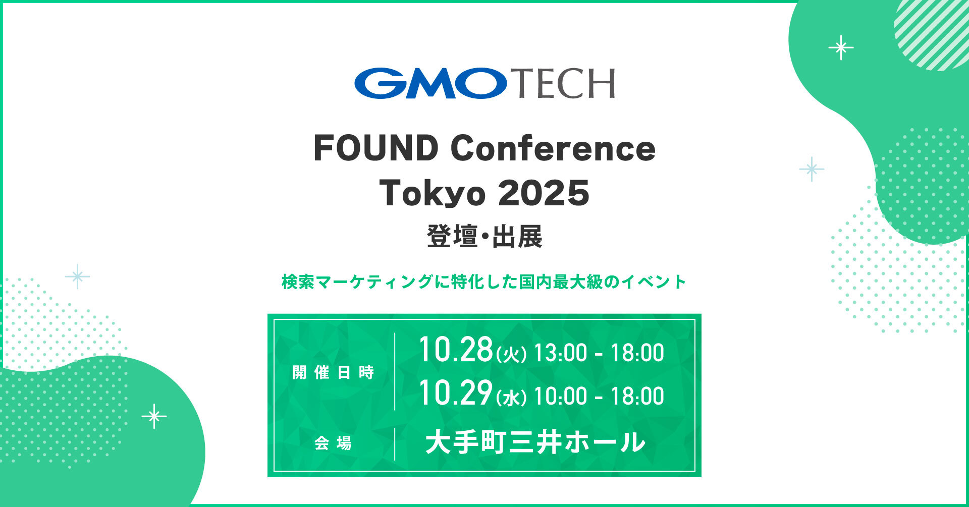 GMOインターネットグループでインターネット上の集客サービスを展開するGMO TECH株式会社(代表取締役社長:鈴木 亮一 以下、GMO TECH)は、2025年10月28日(火)・29日(水)に大手町三井ホールで開催される、検索マーケティングに特化した国内最大級のイベント「FOUND Conference Tokyo 2025」にて、セッション登壇およびブース出展を行います。